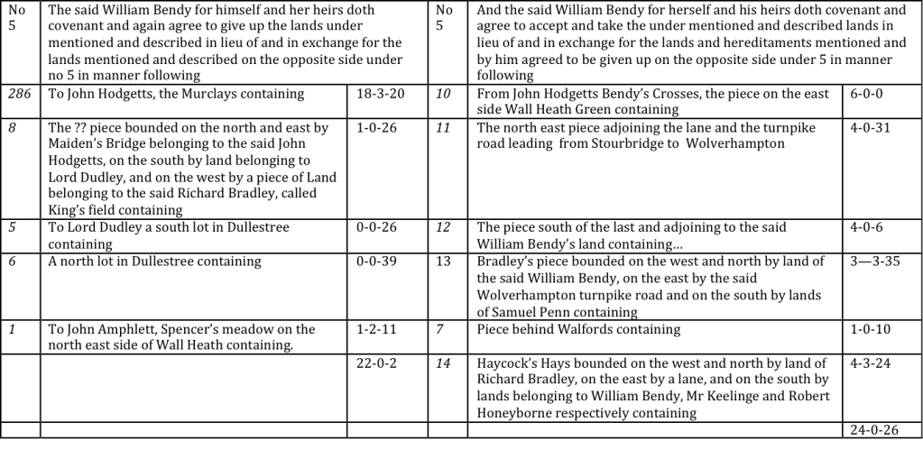 The second transcription is of lands relinquished and received by William Bendy (figure 5). From the tree of figure 3.6 in KMP it can be seen that this refers to William Bendy (1700-1782) the son of the second marriage of his father, William Bendy (1653-1725). He was the minor beneficiary of his father’s will, most of whose estates going to the Hodgetts and Dolman families, through the marriage of the daughter’s of his first marriage. He relinquished 22 acres of land in 5 lots. Four of these, amounting to around 4 acres, can be confidently placed in the area of Wall Heath field to the east and north of Wall Heath itself (figure 6). The major area, referred to as the Murclays, which was relinquished to John Hodgetts (1721-1789), cannot be precisely located with confidence, and was almost certainly subdivided by 1822. It is possible that it corresponds to an area of Wartell field close to Kingswinford village, that was owned by his son, John Hodgetts Hodgetts Foley (1797-1861) in 1822, which has an area of around 20 acres. It would have been close to the latters Shut End Estate, which itself had been inherited from William Bendy (1653-1725) through his great-grandfather’s marriage to William’s daughter Mary. In return the later William received six parcels of land amounting to 24 acres, with no indication that the areas would be equalized in the Enclosure allocation. These areas cannot all be located, but were clearly contiguous in the main with land he already owned, so again there seems to have been a consolidation of land. Those that can be located were to the east of Wall Heath bounded by the turnpike road. We know that William Bendy lived in the New House, somewhere on the Wolverhampton to Stourbridge Road in that area, so these lands were presumably around that house. A possible location is the triangle of land between Wall Heath and the turnpike road shown on figure 6, where the 1822 map shows a significant dwelling. On the 1882 OS map, this is named as Dawley House.