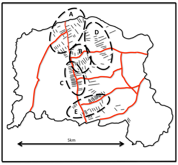 The Ashwood Hay Enclosure Act of 1776 discussed in Chapter 3 in “Kingswinford Manor and Parish” (KMP) mainly relates to the formal enclosure of around 600ha of land in the west of the parish of Kingswinford (see figure 1 which is figure 2.9 in KMP). However, it also contains extensive details of land exchanges between proprietors in the area marked as Common Fields Enclosure, which were not considered in any depth in KMP. These formalize long term leases that were entered into about a century before the enclosure to consolidate land holdings in the area, moving away from the concept of individuals holding strips in each of the three open fields. Figure 2 (figure 2.6 in KMP) shows the conjectured position of these fields that seem to have been variously named over the centuries – Wall Heath / Mosgrove field represented by the area A, Kingswinford / Old / Wartell field by area B and Wordsley / Broad field by area C.