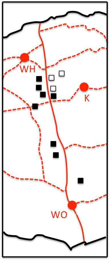 (solid red line is turnpike road; dotted red lines are other roads; red circles are Wall Heath (WH), Kingswinford (K) and Wordsley (WO); filled black squares are lands that were relinquished; open squares are lands that were received)