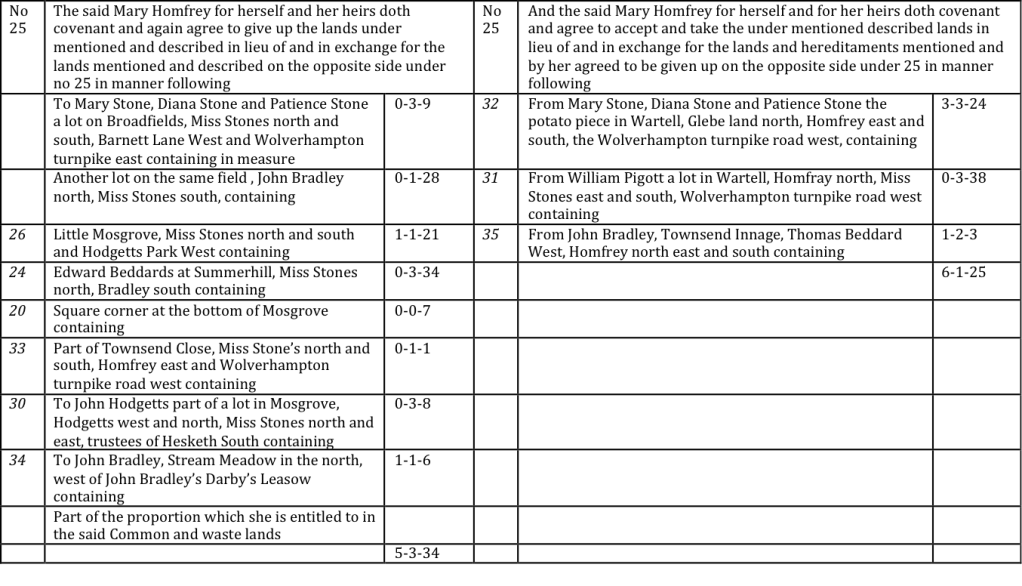 The first exchange is shown in figure 3 for lands relinquished and received by Mary Homfrey, a relatively minor landowner in the parish. The lands that she relinquished were somewhat scattered in Wallheath / Mosgrove field and Wordsley / Broad field, mainly to the west of the Stourbridge to Wolverhampton turnpike road, but with at least one on the east in Wordsley field (near Stream Meadow) (figure 4). The lands that she received were in Kingswinford / Wartell field, and there it is clear that they all bordered land she already owned. She received about half an acre more than she relinquished, and it is stated that this will be allowed for in the division of the common lands in the Ashwood Hay enclosure.