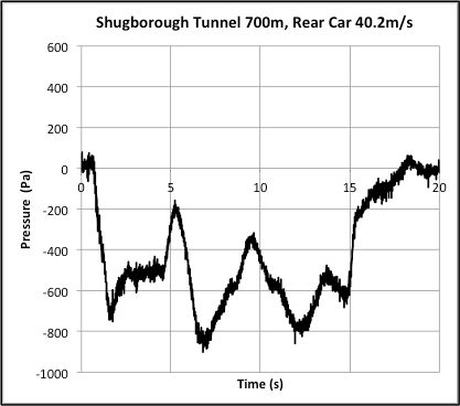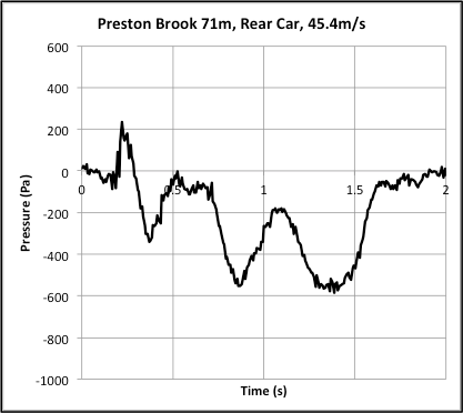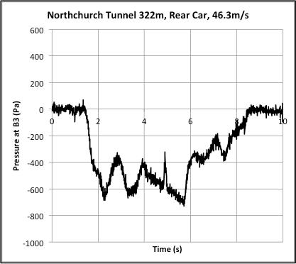 The situation is somewhat different when the measurements are made at the rear of the train. By the time the measurement point enters the tunnel the initial wave system caused by the train nose will have traversed the tunnel four or five times, and friction will have attenuated its magnitude significantly. From the pressure data shown, it can be seen that the measurement point experiences a small period of positive pressure, before the expansion wave from the rear of the train passes over it causing a sharp drop in pressure. This tail wave then dominates, reflecting from the far end as a compression wave, with again an overall period of about 0.4s to 0.5s. The data from Preston Brook thus shows the pressure variations due to single waves – either the nose wave or the tail wave.