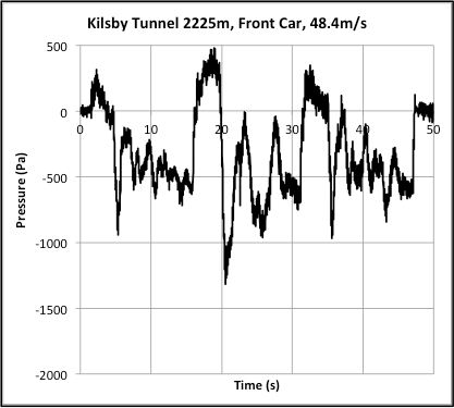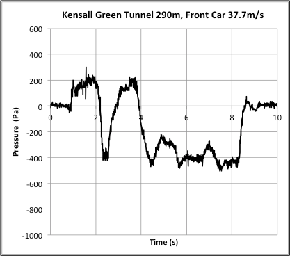 The pressures that will be presented were measured on the side of the train, although pressure varied little around the circumference in most cases. They were measured against a reference pressure in a leaky reservoir on the train itself, and a small correction was required to relate them to atmospheric pressure. The main unknown was the actual configuration of the NMT at the time the measurements were made. The NMT could run as two power cars plus anything between 3 and 5 coaches between them, giving train lengths of 115m to 161m. The pressure measurement points were 14m from the end of the power car. Also, as these were operational runs, the train speed could vary by several m/s during any one run. Thus the velocities that are given below must only be regarded indicative.