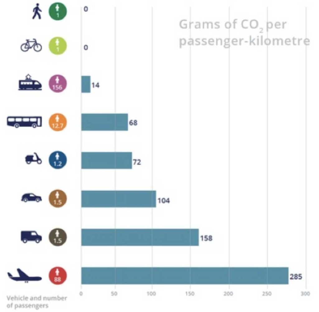 As was remarked earlier, there is however an elephant in the room – the carbon emissions from transport. Indeed the February 2020 synod document has only two mention of transport, one of which rather dismisses the effect with a single mention that electric cars will solve the problem; and the other suggest limiting air transport. Emissions from all forms of transport can be very significant – see the graphic below. Figures shown are grams of carbon emitted per passenger kilometre for an average loaded vehicle. Clearly public transport emissions (particularly electric trains) are significantly lower than those for private vehicles. Air transport emissions are very high indeed. Electric cars may be part of the solution, but until there has been a major decarbonisation of electrical supply their use is not without issues. In any case, electric cars are, just like conventional vehicles, major producers of particulate matter that it is becoming increasingly appreciated is responsible for respiratory problems, child development issues and early deaths. It is generally agreed by at least the younger generation of transport engineers and planners, that the only way forward to achieve carbon neutrality and minimise other environmental effects is through the encouragement of walking and cycling and public transport use, and the restriction of personal transport.