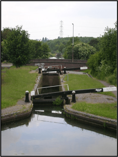 Brades Hall locks (from https://en.wikipedia.org/wiki/Gower_Branch_Canal#/media/File:Brades_staircase_locks,_Gower_Branch.jpg)
