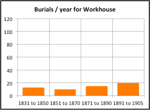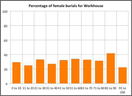 Figure 5 shows similar figures for Workhouse burials. It can be seen that the number of burials per year is between 10 and 20 – a significant proportion of the whole. The burials by age show the same form as for the general population, although the child mortality rate remains at around 35% throughout the century rather than falling. The percentage of female burials by age do not show the same trend as for the general population, although this might possibly be because the sample size is smaller and any trend masked by statistical variation.