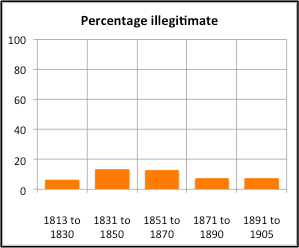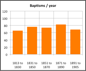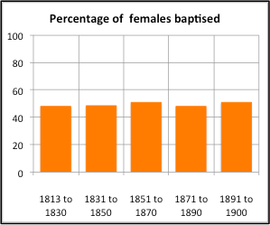 Figure 2 shows the basic statistics from the baptismal register for the period between 1813 and 1905. Here the data is shown in nominally 20 year bands, with the first (1813-1830) and the last (1891-1905) being somewhat shorter. This variability in period can be allowed for to some extent by considering the number of baptisms / year in each band. It can be seen that there were around 70 baptisms a year across the period, with that figure remaining relatively stable. The expected rise in baptism numbers due to population growth thus seems to have been balanced by the number of baptisms taking place in the new chapels at Burntwood, Wall and Christchurch, and also no doubt by an increase in the number of baptisms in non-conformist churches. The percentage of females was baptized was close to 50% throughout the period as would be expected, which at least shows the inhabitants of the parish in the 19thcentury did not practice female infanticide. Finally it can be seen that that the number of illegitimate children baptised is around 5 to 10% of the whole. This graph may not be wholly accurate however, as illegitimacy was recorded in different ways over the century, or not recorded at all, so some cases may have been missed, but any errors will be small.