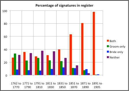 Figures 3 show the marriage statistics . This data is given over a longer period than for the baptismal reisters, as the .rtf transcription extends back further into the 18thcentury. The number of marriages per year peaks at something over 40 marriages per year between 1811 and 1830. The register also provides an indication of the level of literacy amongst those getting married. The right hand figure gives the proportion of weddings where bride and groom both signed the register, just one of them signed, or neither signed. Very broadly, up to the middle of the nineteenth century, there were around a third of marriages where neither couple could sign their name, a third of marriages where one of them could (most often the groom) and around a third where both signed. After that time, the proportion of weddings where both signed increased rapidly, no doubt due to the establishment of the National Schools in the area, and by the start of the 20th century both partners almost always signed.