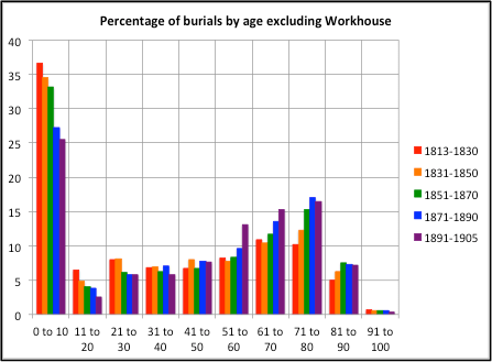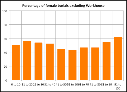 Figure 4 shows the analysis of the burial statistics, excluding the Workhouse entries. The number of burials / year increases through the century, reflecting the increase in population. In the breakdown of burials by age group, the large infant mortality rate is clear, although burials in the 0 to 10 age group decrease from 36% of all burials to 25% over the 19th century. This same trend of reducing mortality is shown in the 11 to 20 and 21 to 30 age groups. The number of burials then increases with age, with a peak in the 71 to 80 age range, with a sharp fall off for the oldest age ranges. The percentage of female burials against age range rises from around 50% for the lowest age range, then increases to around 55% for the 11 to 20 and 21 to 30 age ranges, reflecting deaths during childbirth. There is a trough at just over 40% in the 51 to 60 age range as male mortality peaks, with a rise to around 60% in the highest age ranges, which simply reflects the greater longevity of women if they survive infancy and childbirth.