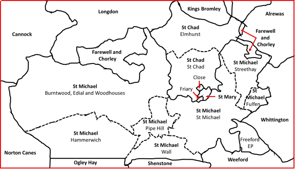 - St Chad’s parish, St Chad’s township (H). Here the situation is again complex. There are large allocations to Freeford and Weeford, together with a large allocation to the prebend of Gaia Major in the central area. There are also smaller allocations to the major prebends in the residential areas, and also small allocations to Bishopshull, Curborough, Gaia Minor and Pipa Minor.