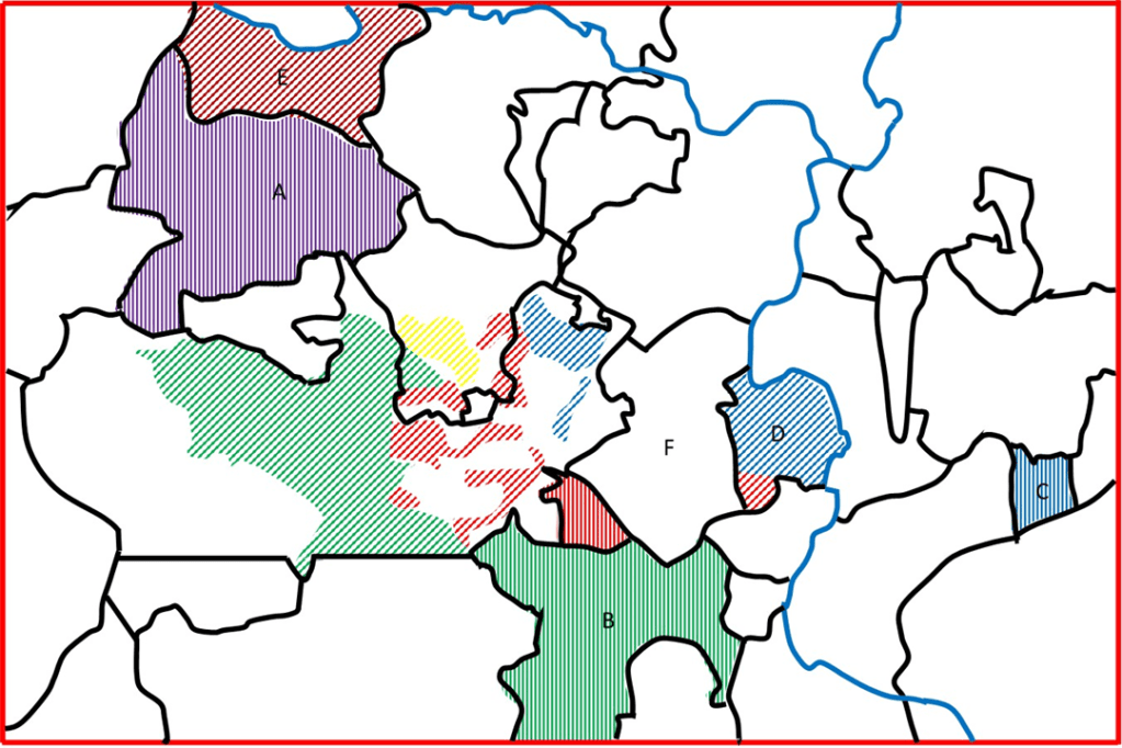 (Letters referred to in text; diagonal stripes indicate prebend to which tithe allocated; vertical stripes indicate region with name of prebend; red – Freeford; green – Weeford; blue – Statfold; yellow – Gaia Major)