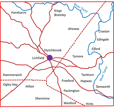 A comparison of the prebend areas with the road system shown in figure 1 is of interest. Basically each of the prebends is connected with the centre of Lichfield via an ancient road – Freeford via the road that is now the Tamworth Rd, Weeford by the London Road and the Roman road network, Longdon by the Stafford Road and Hansacre by the road to Rugely. Statfold is connected by the road that enters the city via Darnford Lane and Boley Cottagee lane. If this extended all the way to Statfold, its route east of Whittington is however not clear. The prebends thus form a well-connected network with easy access to the central area.