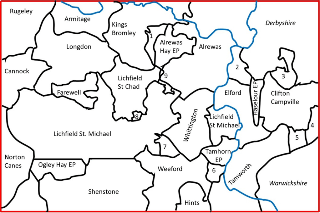 (1 – Kings Bromly Hay EP; 2- Croxall; 3- Ingale; 4- Thorpe Constantine; 5 – Statfold, 6- Hopwas Hay EP; 7- Freeford EP; 8 – St Mary’s, Lichfield; The Close EP; The Friary EP; 9 – Detached parts of Farewell)