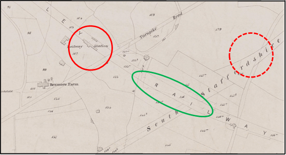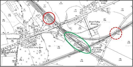 The positions of the first stations in the area are shown on the Lichfield St. Michael parish (Streethay township) Tithe Map of 1848, an extract from which is given in figure 2. The current station location is indicated by a green oval. The original 1847 Lichfield station of the London and North Western Railway (red circle) is on the west of the Turnpike Road, with platforms on either side of the track, and the main station building on the down line. The station is illustrated in the drawing of figure 1 and can be seen to be quite a substantial affair, designed by the architect John William Livock in the gothic style. It was clearly designed to make a statement as to the importance and grandeur of the company. As was normally the case at the time, the platforms were much lower than is the case today. The Turnpike Road crossed the railway on a flat crossing rather than the current bridge, and it is likely that passengers also used this crossing.  The map also shows the line of the South Staffordshire Railway that crosses the London North Western line, although that was not completed when the map was produced and not opened until 1849. Its station (Lichfield Trent Valley Junction – indicated by the dotted red circle) was just to the south of the point where the  line crosses the Old Burton Road and was connected to the LNWR station by a chord as shown in the 1882 Ordnance Survey Map of figure 3. It is not known if there was also a pedestrian connection between the stations, but one can surmise that there was as otherwise the walk between the two would have required a considerable trek along local roads and tracks. (For those who know this area, this would have entailed a walk down Burton Old road in Streethay, to the current junction with Cappers Lane, which did not exist at the time, then along Burton Old Road east to the path across the Cross City line by the tip, then up Trent Valley Road to the other station.)