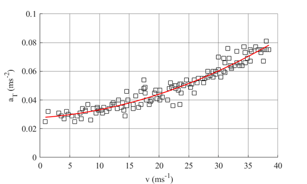 Referring back to equation (3), K2 is a friction coefficient for train, combining theeffect of skin friction on side and roof and bogie and underbody drag. As can be seem from figure 3, values of 0.004 are typical for high speed trains (but note the quality of fit is not terribly good).