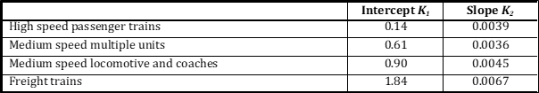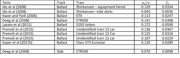 Typical values of the former are 0.0015 and typical values for the latter for ballasted track are 0.03. The higher values for underbody coefficient are of course to be expected because of the roughness of the train underbelly. For slab track the one set of data available gives a significantly lower value of the underbody friction coefficient of 0.01.