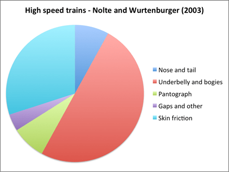 Figure 4 shows how the components of aerodynamic drag for high speed trains from the work of two different authors. Whilst there is some variability between the results it can be seen that the drag of the underbelly and bogies contributes 20 to 50% of the overall drag and skin friction drag on the train side and roof contributes 30% to 40%. An important point to appreciate is that the underbody drag includes drag due to the track roughness – energy needs to be used to overcome the aerodynamic resistance of the track itself. This point does not seem to have been well appreciated in the past.