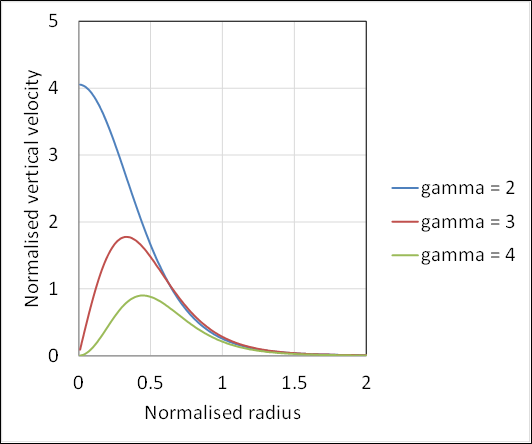 The expressions for the radial, circumferential and vertical velocities in the 2020 model are given in figure 2. Here the velocities are normalized by the maximum circumferential velocity and the radial and vertical distances by the radius at which the maximum velocity occurs. Note that this is different from the 2017 paper where the maximum radial velocity was used for normalization. The parameter K is related to what will be termed the swirl ratio S (the ratio of the maximum circumferential to maximum radial velocity) by a function of the parameter gamma, which is a shape parameter that affects the shape of the radial and vertical profiles. (Unfortunately this web template doesn’t support Greek letters, so I have to spell them out). Figure 3 shows typical velocity profiles for different values of this parameter. It can be seen that for gamma = 2, the peak of the vertical velocity is at the vortex centre, as in a typical single cell vortex, whilst for higher values it moves away from the centre becoming more like a two cell vortex (but note there is no downflow at the vortex centre in this case.