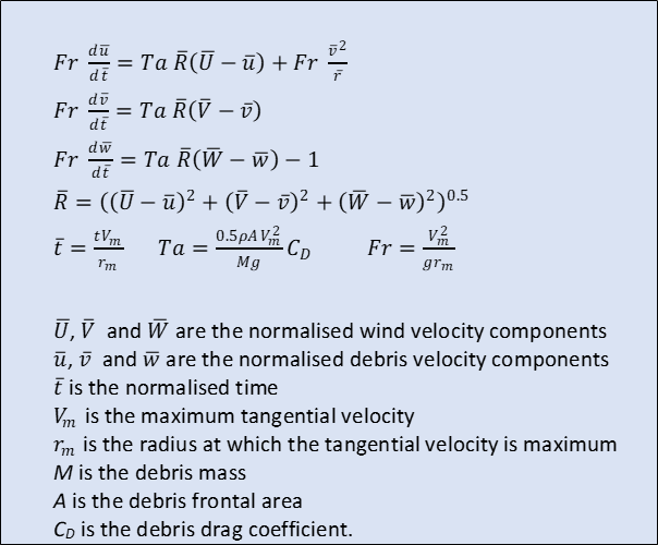 The equations for compact debris flight are given in figure 4. These are the same as in the 2017 paper, although expressed a little differently. The debris velocities (lowercase) in the three directions are again normalized by the maximum tangential tornado velocity. Two dimensionless parameter are identified – the Tachikawa number Ta that relates the flow force on the debris particle to its weight, and a tornado Froude number Fr. Different dimensionless parameters were used in the 2017 paper, because of the different reference velocity that was used