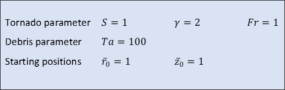 Putting together the velocity equations in figure 2 and the particle flight equations in figure 4, it can be seen that there are four parameter that define debris trajectories – the tornado parameters S, gamma and Fr, and the debris Tachikawa number Ta. In addition any one flight trajectory will be defined, at least in its early stages by the dimensionless values of the radius and height at its release point. If these six parameters are specified then the equations of debris flight can be solved in a straightforward manner. In what follows we define a base case situation as in figure 5, and then vary each of the parameters around this base case value. We present the results in the animations of figures 6 to 11.Each animation shows four plots – the trajectories projected onto a vertical plane through the tornado centre; the trajectories projected onto a horizontal plane; the trajectories in a rotating plane in the radial and vertical directions, and a plot of the variation of particle kinetic energy with time. The latter acts as a damage indicator of debris flight, but also clearly shows whether or not the solution converges or diverges with time. Note that the dimensionless time shown in the kinetic energy plots is proportional to the time of revolution of the vortex – a time of 2 pi corresponds to one vortex revolution.