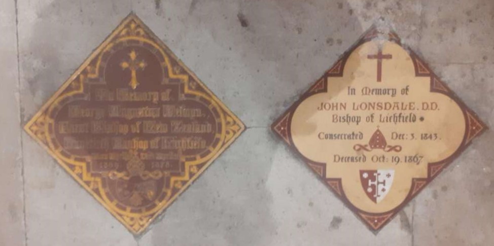 They are also commemorated in floor plaques in the church at the front of the chancel beneath the pulpit, These are positioned (deliberately?) on the opposite side of the chancel to two similar plaques commemorating the lives of two of the 19th century Bishops of Lichfield (Selwyn and Lonsdale) – see below. I strongly suspect this placement was deliberate on the part of the family and church leaders. This is perhaps a final indication of the perceived importance of the Station Master in Lichfield society at the time.