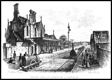In this post I will consider the life and career of Lichfield’s first Station Master, William John Durrad (1817-1889). All the information in this post is gleaned from public sources – registers of birth and death, census records, employment records and the local press. Whilst these can describe a life in broad terms, they cannot really give a proper picture of the person’s character and personality. But in the case of William Durrad, they do show a typical Victorian progression from humble origins to gentleman status, brought about through a mixture of patronage and effort, and cast some light on the life of Lichfield in the nineteenth century.