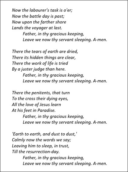 William John died in January 1889. His obituary records that he had been ill for several weeks beforehand following an operation from which he was never to recover. The lead mourners were of course his family – Arthur James, by then Vicar of Ellerburne near Pickering; Walter Richard, Foreign Correspondent’s Clerk at Coutts in London; Bertram George, the English Anglican Chaplain in Berlin; Emma Helen; and Mrs W. Durrad and Lizzie Durrad. The latter were the second wife and daughter of his cousin, the younger William from Eccleshall. His first wife Louisa had died in 1879, without having had children, and having moved to London, he married Elizabeth Whittle, 24 years his junior in 1881. Clearly William John had maintained contact with that branch of his family over the years. The funeral was a full choral service and at the burial the choir gathered around the grave and sang the hymn “Now the Labourer’s task is o’er”.