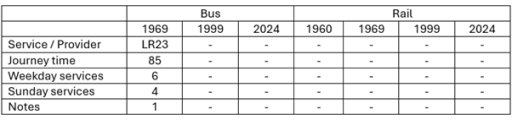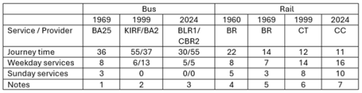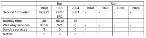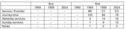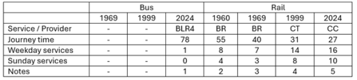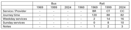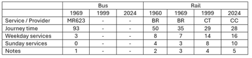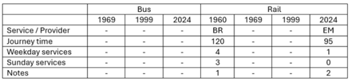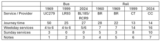 Tables 1 to 3 show, in standard form, the bus and train services between Oakham and Stamford, Melton Mowbray and Uppingham. Journey times and number of journeys / day are shown. Clearly there are both train and bus options to Stamford and Melton Mowbray, but only bus options to Uppingham. The bus journeys in 1969 and 1999 were provided by major bus operators for which Oakham was at the edge of their operating area – United Counties in Northampton, Lincolnshire road Car, Bartons in Nottingham, Kinchbus in Loughborough. Currently they are provided by more local operators – primarily Blands, but with Rutland County Council running the current Oakham to Stamford service. The bus journey times and service frequencies have remained similar over the period (although note that the former can vary significantly depending on what villages are served on the way between urban centres. The loss of Sunday services is obvious from the data in the tables. What is not so obvious is the fact that evening services on all the bus routes have been significantly cut over the study period.