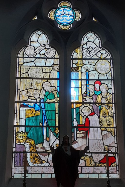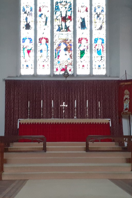 Appropriately, on the eve of St Edmunds Day in November 2024, we paid a visit to St Edmund’s church in Hunstanton in Norfolk (“we” being myself, my wife and our dog).This mid-Victorian church is VERY Anglo-Catholic as can be gathered from the photographs of Figure 1 which show the crucifix in the chancel arch, the baptistry at the west end (with the chapel of Our Lady at Walshingham on the right), and the raised altar in the chancel. I doubt I could ever have managed to get up and down those altar steps safely in a cassock or alb, and certainly now, if I were ever to preside there (which is unlikely in the extreme), I would certainly need a stair rail, and possibly, given the current state of my right knee, a stair lift*. That being said, it is an impressive church interior.