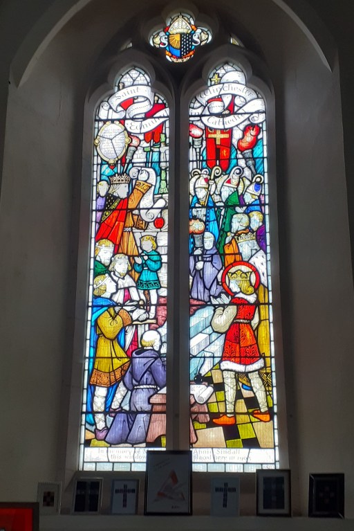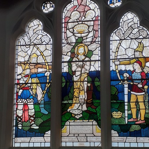 Now whilst there are some fairly conventional depictions of biblical events and saints in the windows in the church, those that I found of most interest are the series of windows that depict the life and death (and afterlife) of King Edmund. In reality, very little is known about him other than the entry in the Anglo Saxon Chronicle of 870.
