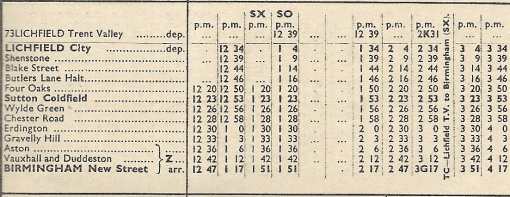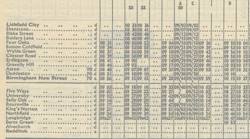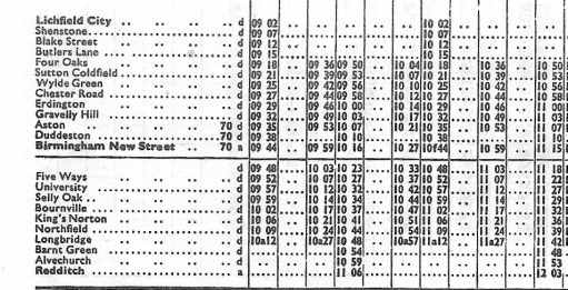 The May 1969 timetable (from the London Midland Region timetable downloaded from Timetable World) shows a more regular service on the north end of the route, with an hourly service from Lichfield City and a thirty minute service from Four Oaks to New Street. South of New Street the trains to Redditch were again somewhat sporadic, with one, two or three hour intervals between them.