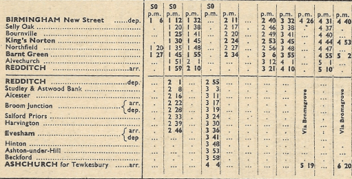 The May 1980 service (shown above from the national BR timetable) is similar to the 1978 service. Here the extract shows no services to Redditch although there were again some sporadic, mainly peak hour services down the Redditch branch.