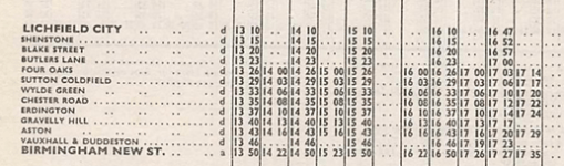 By 1964, the first wave of the Beeching cuts had taken place and the timetables above (again from the London Midland Region timetable) such trains as there were to Redditch from New Street terminated there. North of New Street, the service to Lichfield varied between a thirty minute and an hourly frequency, with hourly trains starting at Four Oaks. Again, there were connections to Lichfield Trent Valley from Lichfield City on the Walsall to Burton service.