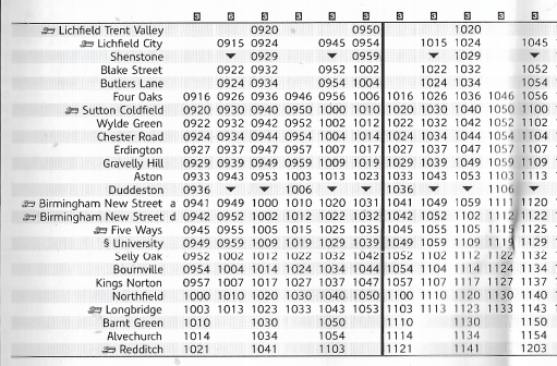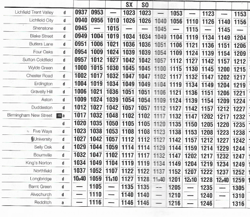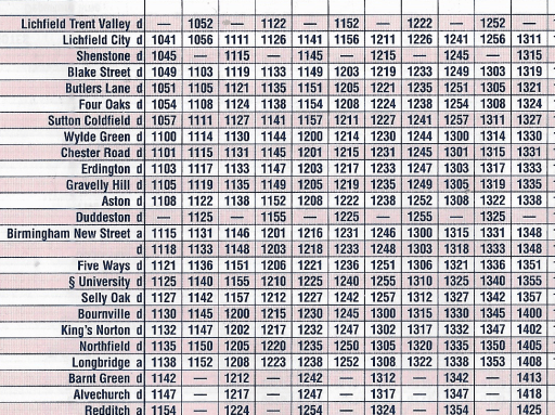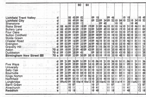 The December to May 1993 timetable is very odd, with the services being split at New Street, with four trains per hour from Lichfield Trent Valley to Birmingham, and four to Longbridge, with two extended to Redditch. There is no rationale given for this but may well have been something to do with the electrification works that were going on at the time.