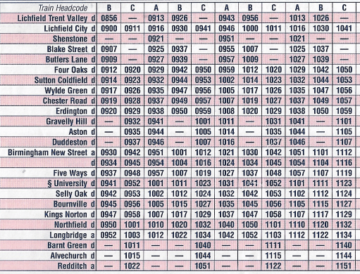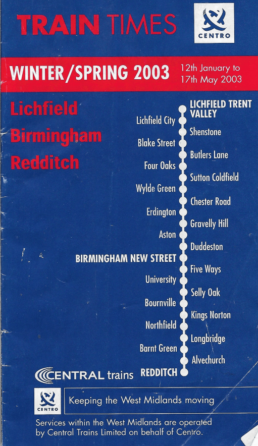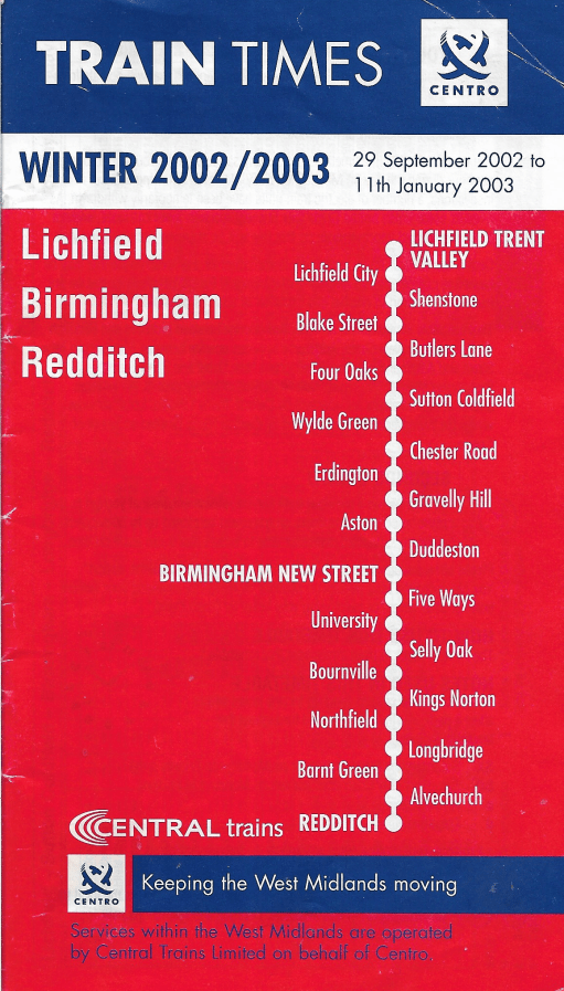 In September 2002, there was something of a revolution. The number of trains was increased to six per hour, with four beginning their journeys at Lichfield Trent Valley, and two at Lichfield City and four ending their journeys at Longbridge and two at Redditch. The stopping pattern was complex with not all trains stopping at all stations. To try to make life easier for passengers, trains were to carry a headcode (that can be seen on the above timetable) indicating their destination and the stopping pattern. To put it bluntly, the service was an absolute disaster. A very frequent service with variable stops needs to be highly reliable – and that has never been the case for the Cross City line, largely due to congestion at New Street. My memory is of confused and angry passengers, very late running and many cancelled trains. Although the ambition was laudable, the pattern was never going to work. My memory is that it was replace by an emergency timetable within only a few weeks of its implementation, but I can’t be certain about that. At any rate, a new timetable was issued from January 2003.
