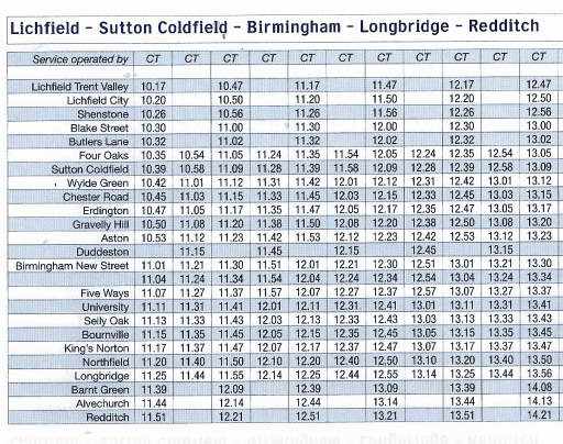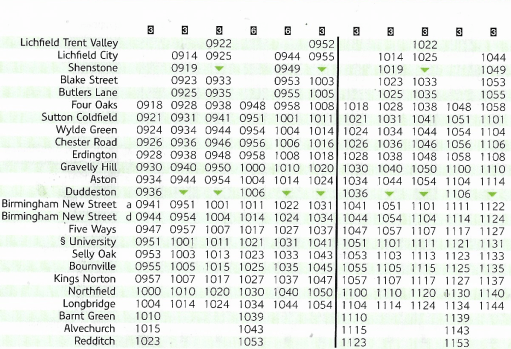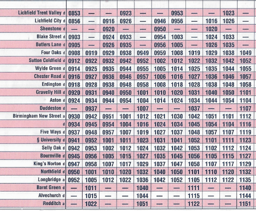 The new timetable again had six trains an hour, two beginning at Trent Valley, two at Lichfield City and two at Four Oaks, with four an hour terminating at Longbridge and two at Redditch. With only minor exceptions (Shenstone and Duddeston), all trains stopped at all stations. From a personal perspective, this led to an unbalanced departure schedule at Lichfield City, with twenty and ten minute intervals, but this pattern was to persist, in essentially the same form until 2018.