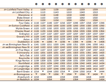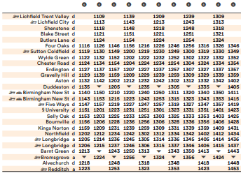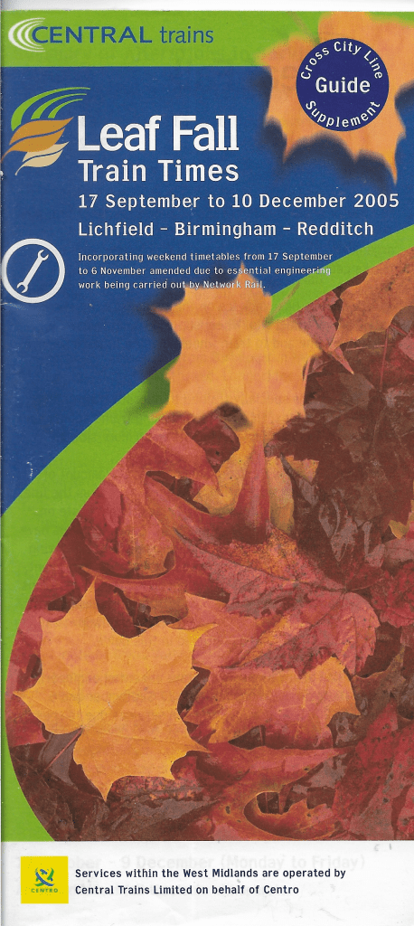 From the early 2000s a “leaf fall timetable” has operated on the Cross City line between October and December, when track conditions can become difficult. A typical example for 2005 is shown below. At the time the normal timetable consisted of six trains an hour, with two starting at Lichfield Trent Valley, two at Lichfield City and two at Four Oaks, with four terminating at Longbridge and two at Redditch. The revised timetable shows four trains an hour, with two starting at Lichfield Trent Valley and two at Four Oaks, with two terminating at Longbridge and two at Redditch. Journey times from Lichfield City to Birmingham New Street were 45 minutes. There was thus both a significant reduction in service frequency and a significant increase in journey time in the interests of maintaining reliability.