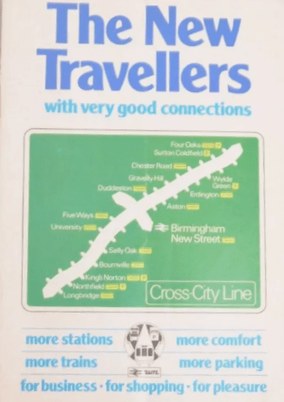 The Cross City line opened in something like its current form in 1978. The graphic above (a screenshot from a rather fuzzy ebay photo) shows that it was marketed as a service between Longbridge and Four Oaks, with a fifteen minute interval service between the stations. There were in fact hourly trains to Lichfield City that were not referred to in the timetable shown, and sporadic trains to Redditch in the south. The route was operated at this stage by Class 116 DMUs. Five Ways station had been re-opened and a new station built at University.