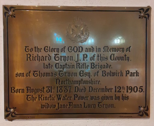 So he was an interesting character in his own right. However it was the words The Kinetic Water Power was given by his widow Jane Anna Lucy Tryon that caught my eye. What on earth was this about? Kinetic Water Power are words I would associate more with my first year fluid mechanics lectures to engineering undergraduates than to tthe interior of churches. However, when I did a quick search of the British Newspaper Archive things became a little clearer.