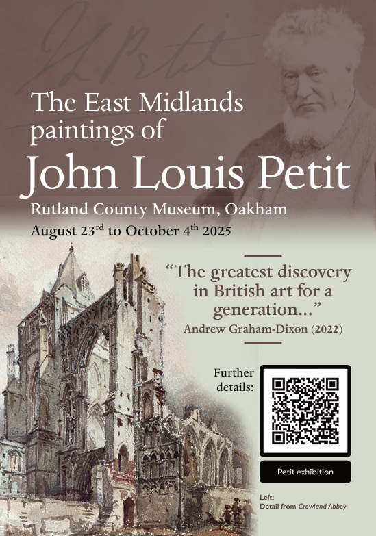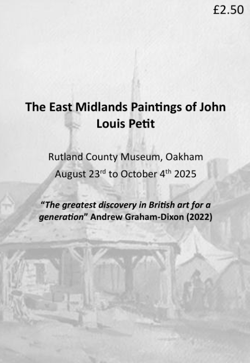 During his career Petit painted many thousands of pictures, but his work was never sold, and after his death in 1868, they were passed on to relatives. A century later they were discovered in an attic in Surrey, dumped in auctions and were widely scattered. Only now is their artistic merit and historical value being recognised. The art critic Andrew Graham-Dixon the greatest re-discovery in British Art for a generation, and the first book about his art, by the chairman of the Petit Society, describes him as Britain’s lost pre-impressionist. Petit’s art of the East Midlands is part of this re-discovery. Close to his home base in Lichfield, Petit visited and painted across the region many times. Often, he paints locations and subjects no other historical artist touched. Some 40 of these pictures were gathered together to be shown to the public for the first time ever at an exhibition held in Rutland County Museum between August and October 2025.