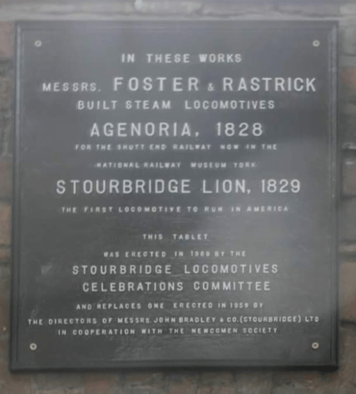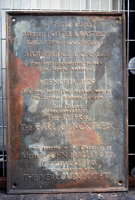 One of my recent tasks as a member of the committee of the Black Country Society has been to help organise an exhibition of photographs and other material at Dudley Archives entitled “From Agenoria to Beeching – the first and last days of steam in Dudley”, which ran from October 2025 to January 2026. This brought together material on the first Railway in the area (the Shutt End or Kingswinford Railway) and its locomotive, the Agenoria, with photos from the 1950s and 1960s that illustrate the last days of steam in the area. As the exhibition drew to a close, I prepared a web version which included the majority of the material in the exhibition and gave it some sort of long term presence. When this online exhibition went live, it resulted in some very interesting email exchanges and conversations with a number of those who looked at it. One of these was with Mr. David Marlow from Northumbria who provided two items that are now actually included in the online exhibition. The first is a photograph of a plaque on the wall on the old (and then derelict) John Bradley and Company factory in Stourbridge (now renovated as the Lion Health Centre), which commemorated the locomotives Agenoria and its sister locomotive, the Stourbridge Lion, that were built there. The second was a copy of a posed picture of the Agenoria with a number of workmen / managers. The original was donated to the National Railway Museum in the 1990s. From Mr. Marlow’s perspective, this photograph was particularly interesting as the “driver” of the locomotive was his great great grandfather Edward Stockton. Both these items raise some interesting chronological questions about the timelines of the Agenoria and the Stourbridge Lion, and these issues are probed in what follows.