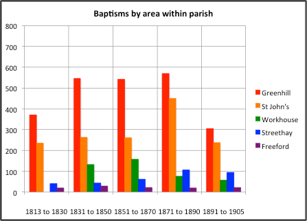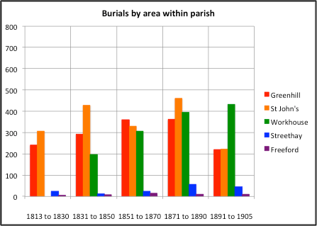 Consider first the baptisms and burials in the different areas of the parish itself. For the former, the largest contributing area is Greenhill, with St. John’s the second largest. The situation is reversed for burials, perhaps indicating a rather younger population in the Greenhill area. The Workhouse baptisms and burials begin in the 1831 to 1850 period, as the Workhouse opened in 1840. In general the number of baptisms decrease with time, while the number of burials increase markedly, until in the period from 1891 to 1905 they are the single biggest number of burials. Both baptisms and burials increase over the century in Streethay, reflecting the growth of railway based activities there, whilst the figures fro the rural area of Freeford / Fulfen remain small and constant.