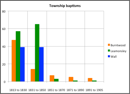 The township baptisms and burials show a major fall after the chapels in the respective area are opened – 1820 for Burntwood, 1845 for Wall and 1848 for Leamonsley. The baptism figures fall more dramatically than the funeral figures, suggesting that a number of township residents wished to be buried in family graves at St. Michael’s.