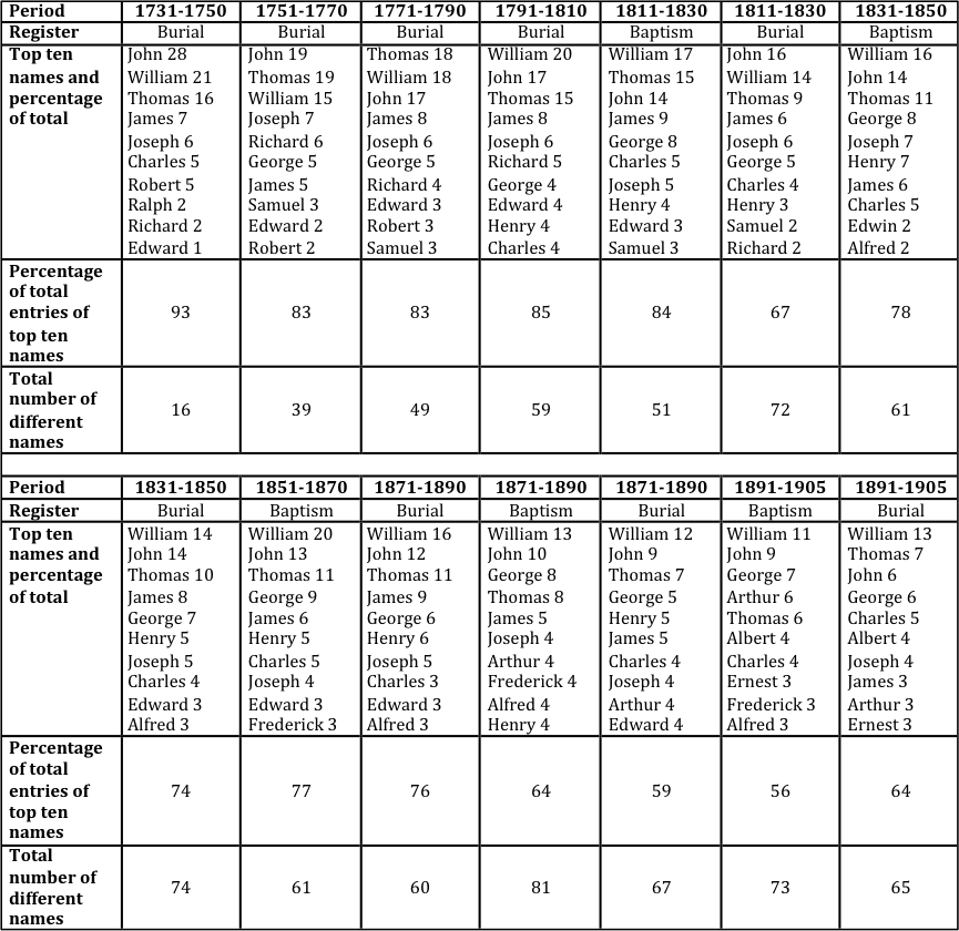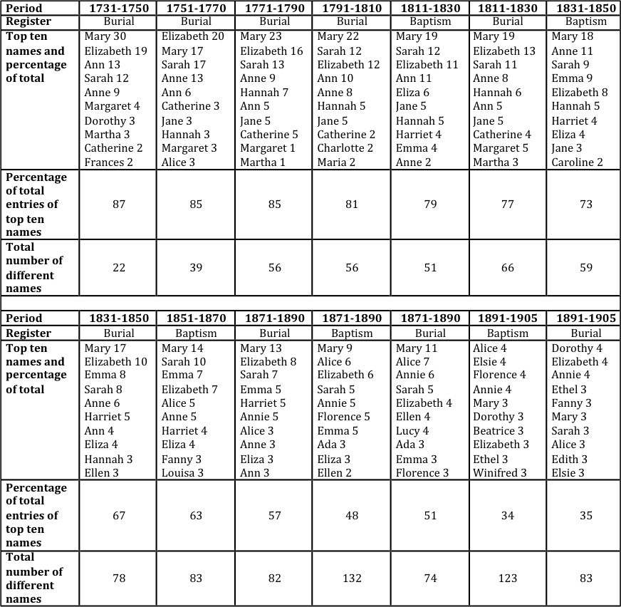 The most popular male names (William, John and Thomas) each account for about 20% of all entries in the early periods, falling to around 6 to 12% in the late 19thcentury. Similarly the most popular female names (Elizabeth, Mary and Sarah) account for around 15 to 20% of all entries in the earlier periods, falling to around just 3% in the late 19thcentury.