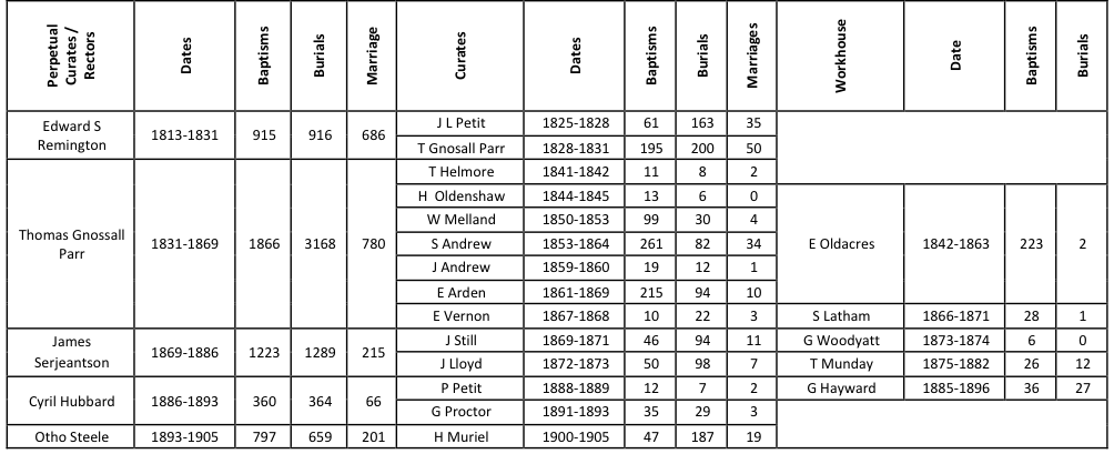 Table 3 below shows the Perpetual Curates (Rectors from 1868) at St. Michael’s, their curates or assistants, and the chaplains of the Workhouse in the period we are considering, together with the absolute numbers of baptisms, marriages and funerals they carried out. The longevity of the ministers in charge is notable, with only three perpetual curates / rectors from 1813 to 1886. The first of these, Edward Remington, was actually the brother of an earlier Perpetual Curate at St Michael’s and the son of another, the dynasty extending back to 1757. His early career included Perpetual Curacies at St Chad’s Lichfield and Pipe Ridware, before coming to St Michael’s in 1805. In 1820, he was, in addition to St. Michael’s, instituted as Curate at Burntwood, when Burntwood itself achieved parochial status. As Perpetual Curate of St. Michael’s he would already have had oversight of Burntwood, but it seems he was formally designated its first incumbent, at least for a short period until 1828. From 1829 to 1831 he was also Vicar at Wirksworth in Derbyshire. How he managed these two rather far-flung parishes is not clear, but doubtless he utilized the services of his curates.