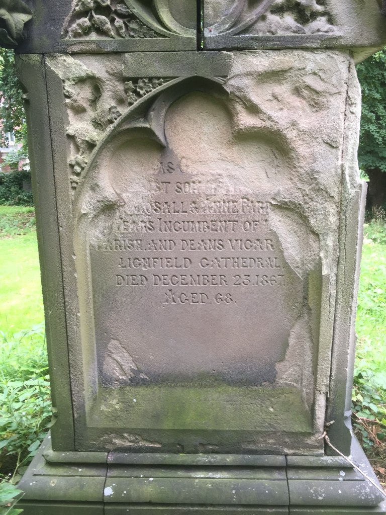 But there is much more that could be said of course about some of the many individuals who feature in the registers – for example Rev John Louis Petit, the curate from 1825 to 1828 and a noted landscape painter, James Law, the Chancellor of the diocese, whose Mausoleum still dominates the front of the churchyard (see below), John Brown, who sounded the trumpet at the charge of the Light Brigade, and many others from long term Lichfield families.