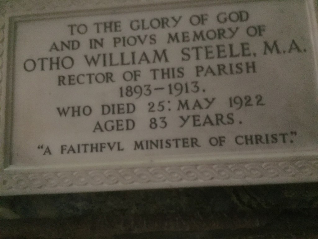 To the glory of God and in pious memory of Otho William Steel, M.A. Rector of this parish from 1893 to 1913 who dies 25thMay 1922 aged 83 years.
