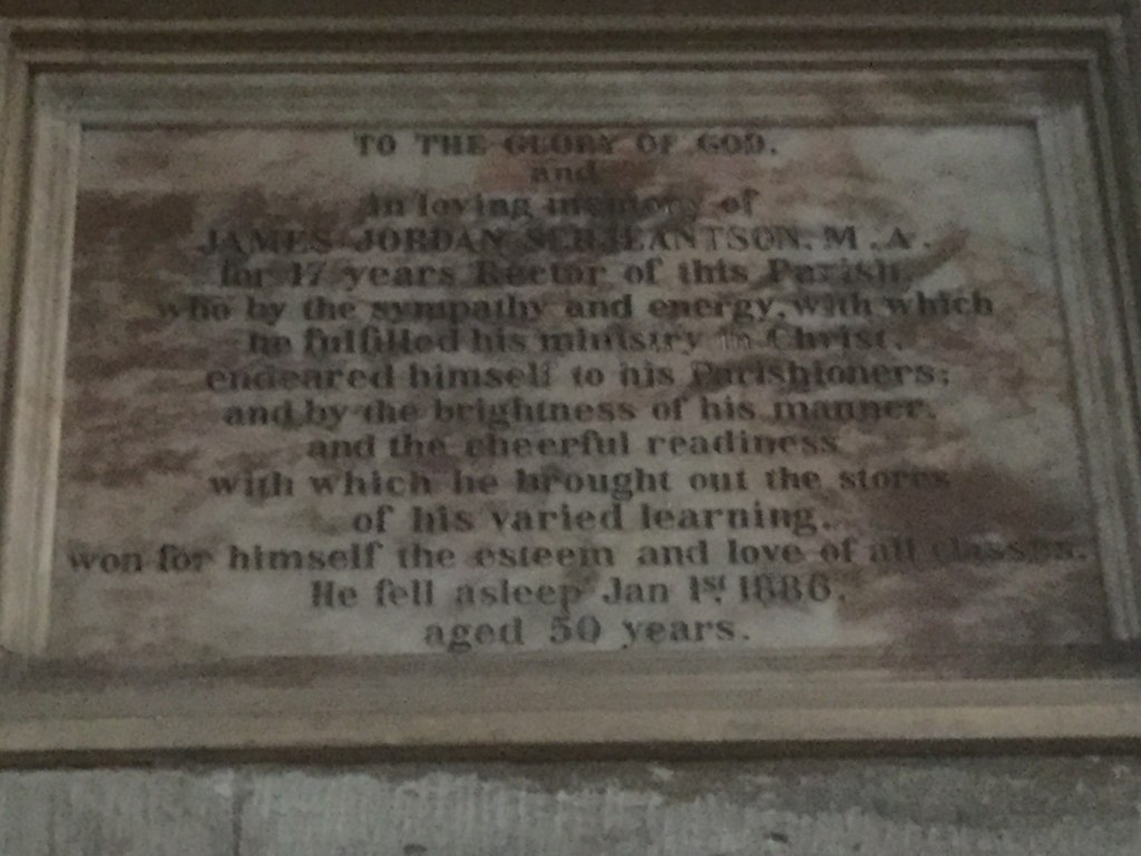 To the glory of God and in loving memory of James Jordan Sergeantson M.A. for 17 years rector of this parish….. He fell asleep January 1st1886 aged 50 years.