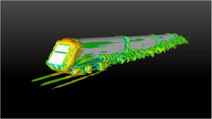 Finally, Wang et al (2020d) investigated the wake structure of a two-car high speed train as the Reynolds number increased from 5 x 105 to 2 x 107. They showed that the overall flow pattern, in terms of large-scale vortex structure, tail separation positions and wake Strouhal number, was little affected by Reynolds number, although as the Reynolds number increased, more and more smaller scale vortex structures could be seen.