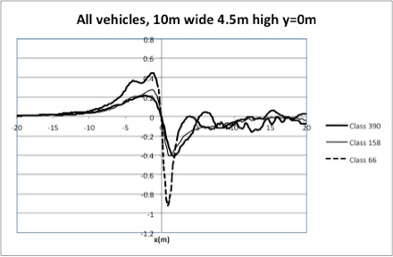 A number of investigators have studied these loads, using full scale, physical model scale and CFD methods. The most common structures investigated were noise barriers of different types, and a range of data has been obtained that adds to the general database of train loading on such structures. Xiong et al (2020) report a series of full-scale measurements to investigate the loads on noise barriers on bridges caused by different types of high-speed train running between 390 and 420 km/h. The variation of pressure with position on the barrier was measured and the results compared with earlier data from other experiments and codes. Oddly, the variation of load with train speed was considered in a dimensional way and was shown to increase with the square of the train speed – unsurprisingly implying that the pressure coefficients were constant. Also, a Fourier analysis of the unsteady data was carried out, which was not appropriate as the loading was deterministic rather than stochastic. Zheng et al (2020) measured the vibrational characteristics of semi-enclosed sound barriers at full scale, consisting of a box over track with panels on one side and on half the roof and an open lattice structure on the other side. Measurements were made using accelerometers and pressure loads were not measured directly. They supplemented their data with RANS CFD and FE vibration analysis. The CFD was validated for a short train against earlier tests and used to predict loads for the full-scale case that were then used in the FE analysis. Good agreement was found with the full-scale measurements of accelerations. Interestingly the authors found that to predict the measured vibrations, it was not necessary to take into account the mechanical vibrations caused by the passing train – this is somewhat contrary to previous work and is probably a function of the rather rigid geometry of the semi-enclosed barriers. Du et al (2020) investigated the pressure loads on a range of geometries of low noise barriers caused by the passage of high-speed trains, using moving model tests. The loads due to both single and passing trains were measured. The effect of train speed was again investigated through looking at dimensional pressure values only – but in effect show a near constancy of pressure coefficient as would be expected. Luo et (2020a) made similar moving model measurements on two coach Maglev trains passing noise barriers, and investigated various barrier geometries using IDDES simulations. Unsurprisingly the authors found that the pressures on the barriers were well in excess of open air values. Slipstream values were also measured and calculated in the gap between the train and barrier.