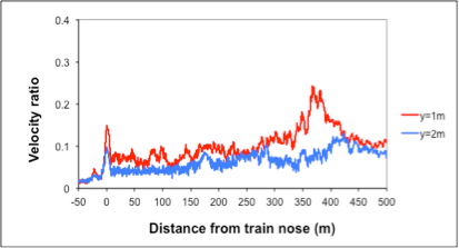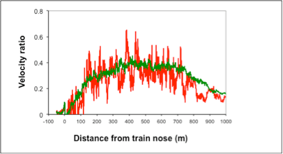 The major aerodynamic feature of the flow in the nose region is of course the large pressure fluctuation that occurs as the nose of trains pass an observer. The major practical issue arising from this is the loading on passing trains or structures next to the track.